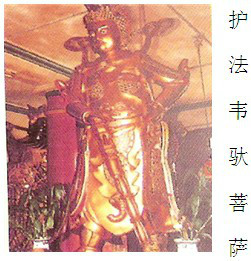 (3)韦驮菩萨——弥勒菩萨的背后是韦驮菩萨,他有特异功能,面向大殿是表示护持三宝,他整天忙忙碌碌保护修行者,要使常住兴隆,法轮常转。韦驮菩萨像有几种姿势,一种是左手叉腰,右手拿着一根宝杵(金刚杵),宝杵到地,这个姿势表示(止单),意思是所有土方客人,包括出家人及在家人,来寺院参礼欢迎,但暗示本佛寺不接待外来客人住宿,敬请另觅住处,另一种姿势是合掌,掌上横放着宝杵,面颜慈祥,这尊菩萨表示欢迎大家来挂单。