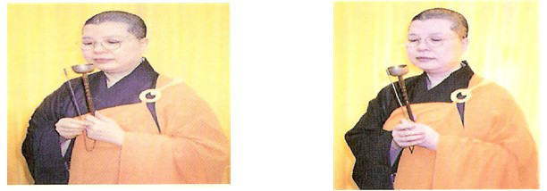 引罄——持引罄时,左手持引罄,右手相抱引罄对口,手平胸。敲引罄时左手拿引罄,右手拿椎,用食指勾出。