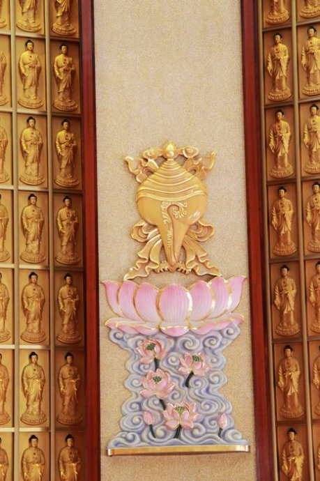千佛山菩提寺阿弥陀佛殿的壁雕:汉传佛像、藏传法螺