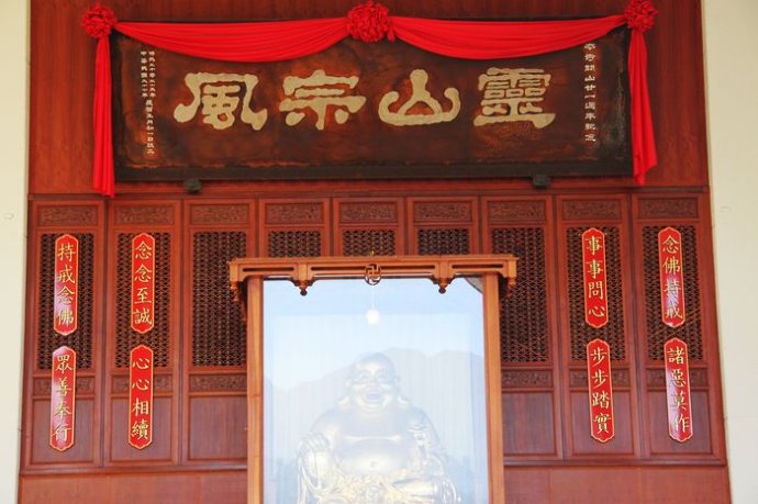 绕过拐道,就到了一座高高的殿堂前面,正面写的是“弥勒殿”三个字,两边对联写:“大肚能容天下烦恼恶事,开心欢笑世间都是善人”。里面供奉着大肚的弥勒菩萨像,上面牌匾上写着“灵山宗风”四个大字,苍穹有力,下面分成左右有几行小字,说:“念佛持戒,诸恶莫作;持戒念佛,众善奉行。事事问心,步步踏实;念念至诚,心心相续”。