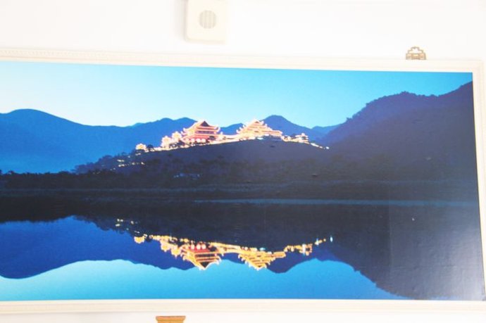 走到这面写有“看东土”和“望西方”的墙右侧,就是大悲殿,也是他们的客堂,我们进入客堂内,看到几位法师和一些义工正来来回回从客堂往外面的车上搬运一箱箱的大悲水。客堂的一位法师接待我们进去,互相认识过后,招呼我们坐下,然后给我们介绍灵岩山寺说:“我们从九·二一大地震后开始重建,重修已经十年了。现在常住有八十几位,女众比较多,在我们隔壁的仁爱巷还有,一百二十多位。男女众是分开住的,地方有十几甲,也有义工住在山上护持,但是人数不多。”