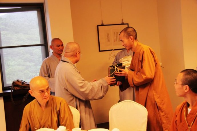 法鼓山方丈果东大和尚在给大陆参学者送别的午宴上赠书