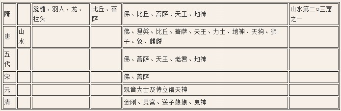 五代时期,于干化五年(九一一)回鹘人侵入敦煌地方。又贞明五、六年(九一九—九二○)时,敦煌地方的政权,乃由张氏移至曹议全手。自此以后的石窟,多有年号记载。显受前代张氏石窟习惯影响。然而,这时期,多为改修古代石窟,而另立新的名目。新开石窟数量,最显著者则有三十六。其制作年代据水野清一氏所揭如次。