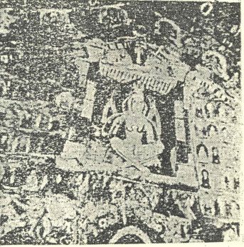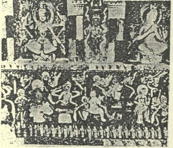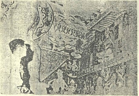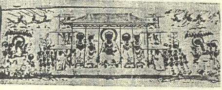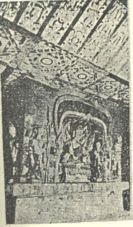描写乘马太阳神,不仅佛堂布置如此庄严,即奥壁(图二十三)以一坐佛为中心,左右配以诸菩萨,上方千佛坐像七躯,左右外缘二列小画,下缘表现功德者小型构图,即所谓曼荼罗的图案,这近于敦煌壁画中普通的型式,更以本生谭为中心描写,并以唐草文装饰,其穹窿与十寺址同。这是唐代佛寺的庄严典型。