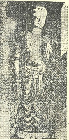 址,发掘木刻龛像,区分上中下三段。上段立佛像,中段立佛足,下敷发的菩萨,是为善慧童子本生图。下分二;菩萨与二供养者像(见西域文化研究一三五页 272 揷图)。在板绘方面,斯氏于第七寺址,发现交脚菩萨像(图二十七),殆从赫色勒壁画构想中抽出,显得特别单纯,这种形式当比后来壁画显得古老。这与前述北魏石刻交脚菩萨像,同一模式(图十九),而背光又与太和十三年(四八九)铭金铜二佛及坐像相似,斯坦因于第一三寺址,又发现洞窟。以坐禅比丘僧像为主的壁画,最感惊异者,即僧像都蓄有须发,交脚而坐(图二十八)。这不仅与敦煌千佛洞,大统四、五年(五三八、九)铭第二八五窟相通,并与前述北魏石刻交脚菩萨像,亦有相互模仿的连带关系。