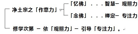 这地方我们解释一下:净土宗的「作意力」就是「忆佛、念佛」,前面讲到「作意」,生命的改变来自如理作意。忆佛是一种智慧的观照,念佛是一种禅定的专注。其实《大势至念佛圆通章》,是《楞严经》的二十五圆通其中一章,它的忆念包括了忆念内在的佛性,就是『真如』。所以从这个地方来说,「忆佛」应该包括了三种忆念:忆念真如、忆念阿弥陀佛、忆念净土,这是整个净土宗的观照力。由这种观照的信愿,带动了持名的专注,次第上是先有观照力才有专注力,这一点要知道。好比一个人先有眼睛,确定要往哪里去,才有脚的开始行动。