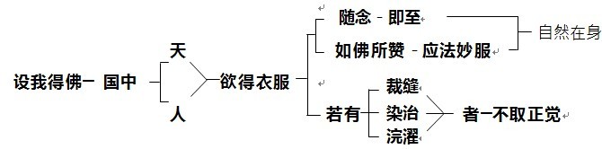 设我得佛,国中的天人,心中生起一种希望,什么希望呢?希望穿某一种衣服,可能是拜佛的衣服,或者是休闲的衣服,或者是运动的衣服等等,那么这些衣服随念即至。也就是说,你心中想要什么样的衣服,马上就心想事成。这些衣服的款式相貌,是:「如佛所赞,应法妙服」,就是正如佛陀所称叹的那种如法的庄严服装。