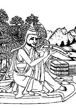 佛灭度后九百年,出了一个婆罗门数论派(Samkhya)外道「自在黑」(Isvarakrsna)。当时有个龙王住在频阇河山的池中,他善解外道之《僧佉论》(译为「数论」)自在黑郄学此论,就去找他。龙王常变作仙人,住在山上茅屋中修道。外道找到跏趺而坐的龙王仙人,说明来意。他来时采了一满蓝鲜花,头顶花篮,绕龙王仙人一周,便掷一花,并作一偈,赞叹龙王的美德。龙王听了他的偈句,也作一偈,来破他的偈义,并拾花还掷外道。于是外道又立偈语,把篮里鲜花掷于龙王。如此且立且破,一篮花尽,咏叹的偈文也完成了。龙王佩服他的诚恳和聪明,终于同意给他讲说《僧佉论》。但感到他相当骄傲,就预先立下誓约,声明:「我说的《僧佉论》不得任意改动。」,外道连口答应。于是龙王一面讲,外道就一面记录。凡龙王未讲及义理不清楚的,外道便一一予以补充改正。等到龙王讲毕,外道的记录也完成了。龙王取过稿件审阅,发现有稿被改动处,不愉快地说:「我叮嘱过你不得任意改动,你为什么不守诺言?」,外道巧辩说:「师是嘱我论完成后不要改动,未嘱我在说论时不要改动;而且请师仔细察看,我在论义上根本没有改动。」,又说:「请师放心吧,以后决不会再改了,只要我本人在世,也决不让任何人损毁此论。」,龙王听了他的保证,同意他将论稿带去。