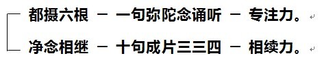 当这个佛号经过念、诵、听之后,听到你的声音,这叫做「一念的相应」,成就专注力;再把十句佛号变成三、三、四,让念佛有节奏-- --『南无阿弥陀佛、南无阿弥陀佛、南无阿弥陀佛』,停顿一下;『南无阿弥陀佛、南无阿弥陀佛、南无阿弥陀佛』;『南无阿弥陀佛、南无阿弥陀佛、南无阿弥陀佛、南无阿弥陀佛』,刚好形成一个循环。因为追顶念,没头没尾、没有节奏比较难摄心。所以印光大师说,用三三四可以把佛号摄住,让它不会跑掉。
