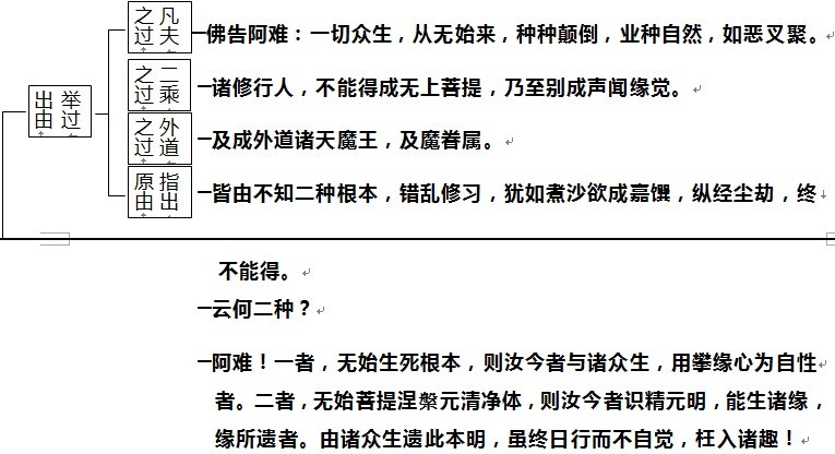 附表四是讲「正念真如」,为什么要正念真如呢?《楞严经》说明一个人依止妄想的过失,分成两大段:第一段『举过出由』,先举出它的过失,说明它的原由;如果一个人没有正念真如,只活在心中的妄想,会有什么过失?有四种过失: