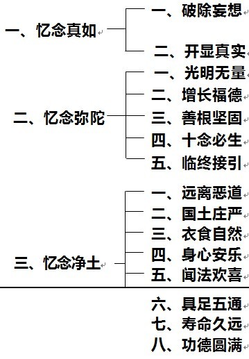 第三个,忆念净土:产生百分之百之愿力。我们往生到极乐净土有什么好处呢?有八种好处:远离恶道、国土庄严、衣食自然、身心安乐、闻法欢喜、具足五通、寿命久远、功德圆满。