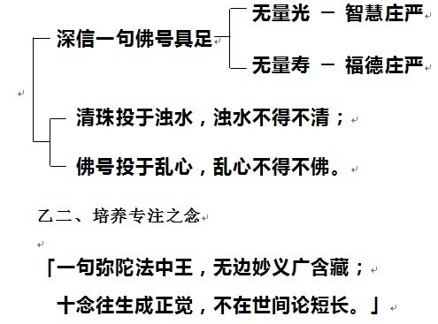 最后看总结:总而言之,我们念佛有二个重点:第一个,你要具足皈依之心;第二个,要培养专注之念。具足皈依之心就是具足信愿,你要深信一句佛号,具足无量光、无量寿,无量光--智慧无量,无量寿--福德无量。