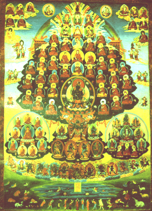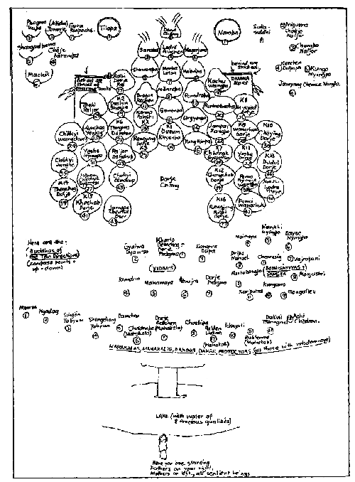在他的头顶上,垂直坐着大手印传承的历代上师(注五),由下而上,分别是:(编著:以下历代上师名号及附记,系参照仪轨实际念诵之名号略加修改,并未完全按照英文本翻译,阅于大手印传承及直接传承之区别,请参阅本刊第一期第12页之噶举传承表,谨此说明)。