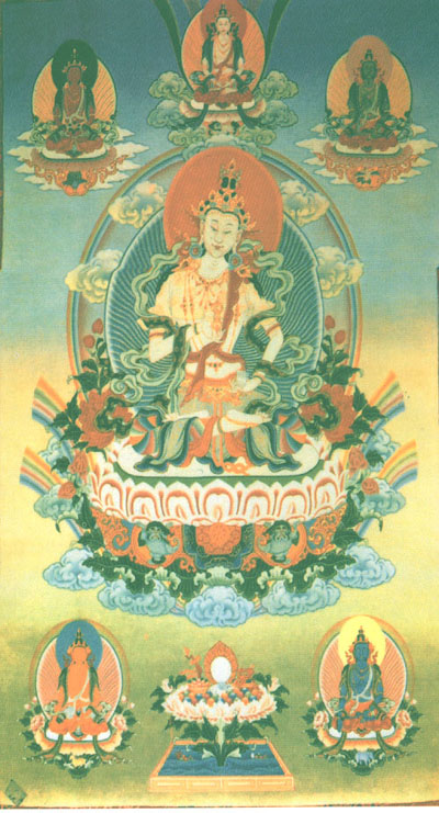 他是用菩萨坐姿(注三),右脚稍为向外伸,左脚向内缩。他的上下衣,都是用珍贵的丝绸制成。他戴著珠宝冠和其他祥瑞饰物。头顶的发髻上坐著他的上师,阿閦鞞佛 (Akshobhya东方不动如来的象征)(注四)。