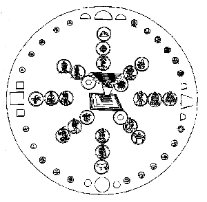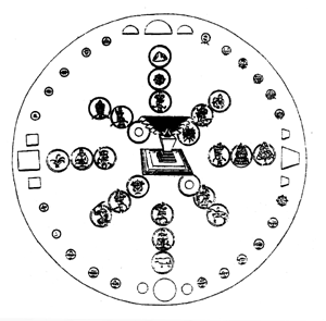 图3 三十七供宇宙曼达。其中数目字表示米撮放在曼达拉盘上的次序,行者想像他自己面向东方。