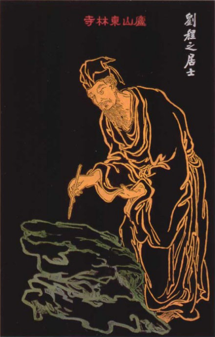 当时慧远大师,居住在庐山的东林寺,修习念佛三昧,刘程之于是前往依止。慧远大师说:‘官禄显赫,云何不为呢?’刘程之说:‘晋朝没有磐石的坚固,有情众生却有累卵的危险,我又何必去作官呢?’当时南朝刘宋的皇帝刘裕因为刘程之不屈服于官禄,因此称他为“遗民”,以赞扬他高洁的德行。同时有一些具有清净信心的士人,如宗悫、雷次宗、周续之、张野、张诠、毕颖之等人,也都来庐山依止慧远大师修行。于是大家在西方三圣像前,营建房舍创立莲社,一同修行净土法门,由刘遗民镌刻石头立下誓愿,其文章曰: