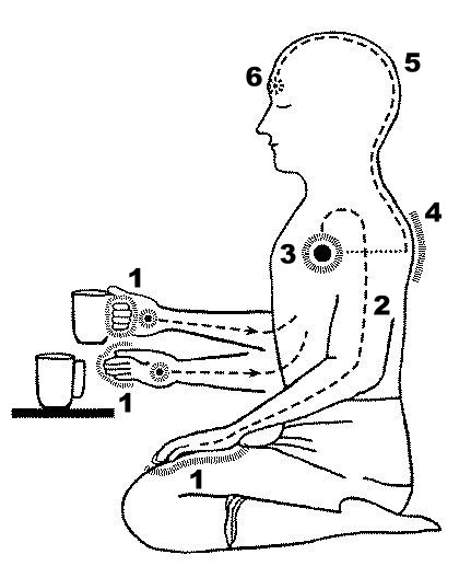 第十六图:正念于其他姿势:例如,手触杯子。当伸手去拿杯子时,观察指尖的感觉;当碰到或握住杯子时,观察感受,并且体验「感受」与「身识」的生灭。