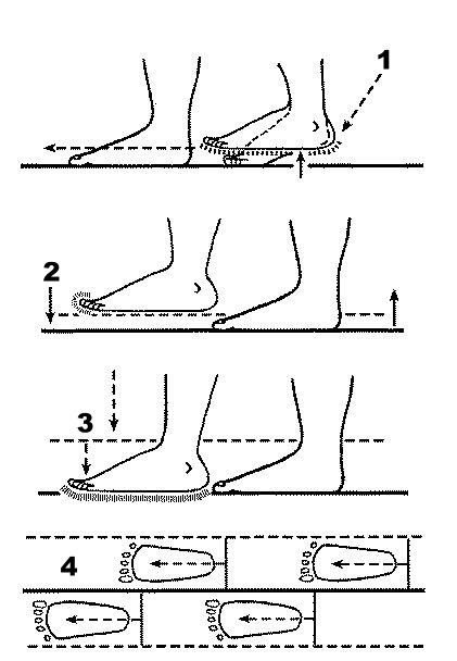 4‧踏下时,脚掌仍指向外侧。而且脚底的外侧先着地。