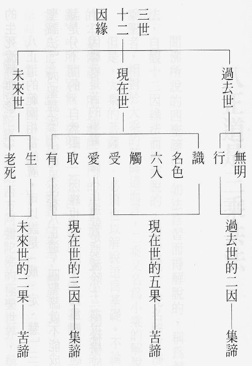 生死苦果的事实,是由造了生死业的苦因而来,即是苦谛与苦集谛。如果顺着苦谛与苦集谛的因果循环,便是十二因缘的生死流转,便是世间的苦海;如果不造生死业,便断集谛,亦灭苦谛,便是十二因缘的生死还灭,便能出离世间的苦海,而得解脱。