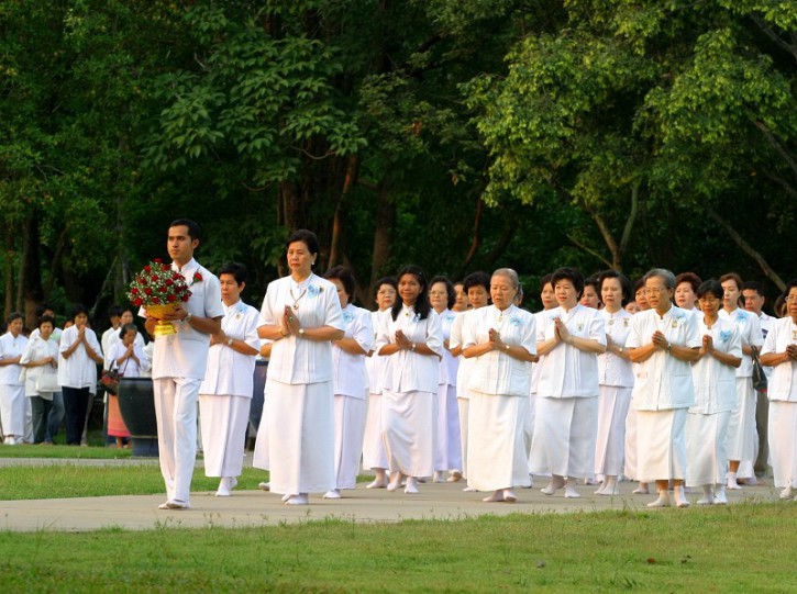 几分钟后,浑厚雄壮的音乐响起,我们每人手捧三朵含苞的莲花,围绕大殿赤脚而行,默诵巴利经文。三匝绕行后,我等走向大殿的红地毯,上了台阶,一字排开,跪拜。