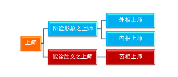 以修行次第见解而论,上师可分为三种:外相顶礼所依之对境为外相上师;调伏自心为内相上师;证悟心之本体即为密相上师。其中,外相上师与内相上师为所诠形相之上师;密相上师即能诠胜义之上师,乃心之本体,亦名本觉、觉性、法界、法性等,不离真实三宝之义。