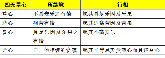 同样缘于慈悲喜舍,若未以出离心、菩提心、空性见、证悟无我之智慧摄持,即为四梵住,此乃梵辅天等四处,其所缘、行相皆有限,未离轮回。反之,若所缘对境无量、有境的心无量,则果无量,方为直趋解脱之四无量心。
