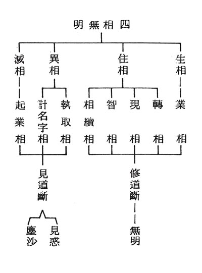 四相无明——生相是指业相;住相里面包括四种——转相、现相、智相、相续相;异相有二个——执取相、计名字相;灭相有一个——起业相。