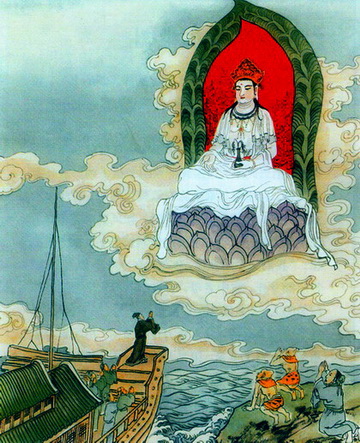 如果有许多人,为了寻求金银财富,在大海上航行。倘若遇上狂风,吹打他们的航船,漂堕到罗刹鬼国。他们之中,若有些人乃至有一人,称念观世音菩萨名号,那么众人都能得到解救。《普陀山志》一书中有所证实。