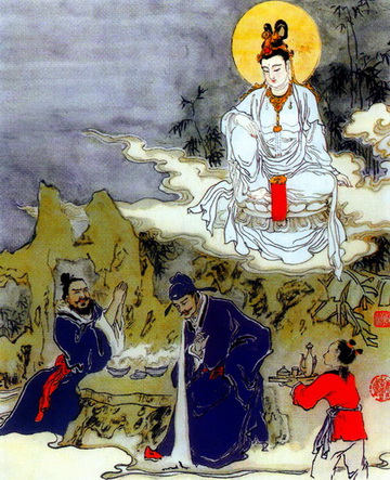 隋文帝仁寿年间,山中出了条毒龙。它常变作道士,在京城卖药。人若服下药,即会立刻升上天去。实则是毒龙以妖法摄入山中龙窟之中,供其食用。这日忽来一位僧人,在山顶上结了一间茅屋,端坐念经。那毒龙的妖法再也使不出来,深藏窟穴,从此不敢外出,民众得到庇护,都来归依求法。次年六月十九日,僧人圆寂。火化之时,东面山峰之上,现出光灿灿金桥,站列诸天神众。天乐袅袅,天花如雨,异香馥郁。整个南五台山,百宝璀璨,谁也不知道有多少。在烟云之问,现出观世音菩萨端严之相,璎珞珠衣,慈祥伟丽。众人才知是观音大士前来显示灵迹啊!