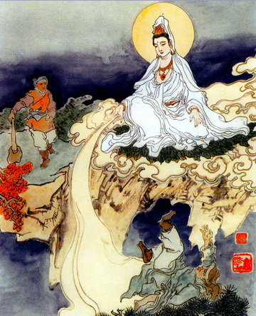 明代人沈文崧在山东做官。他有位同僚,双亲年迈,膝下无子,奉命将往西藏出差,沈文崧慨然代其前往。他跋涉险阻,三年才回来,闻者都赞叹他的高风仁义。随行他的仆人夏祥,为人最是忠心。有一日天色昏暗,浓雾漫天,沈文崧带着两个仆人正走在陡峭的山坡上,下临万丈深渊。一不留神,二仆堕下深渊,沈文崧骑的马,也前蹄踏虚,险急万分。忽然他仰面看见云雾之中,观音大士手持青莲花,向他引导。一会儿,他身子已飞越深渊,到达平地之上。痛失二仆,他心中悲痛不已。此时天色仍很昏暗,他听见有人语声,急忙呼喊,走近一看,原来是夏祥。他忙问怎么脱险的,夏祥说,落下深渊时,有一身长丈余、浑身绿毛的怪物,把他接住并背负上来。于是主仆二人相抱大哭。后来,有个叫高文良的人,画了观音大士像、写上日期记录此事。