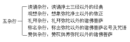 此外,举凡布施、持戒等,并圣道门所重视之菩提心,皆属杂行。亦即五种正行以外之一切诸善万行,不问大乘小乘,为求现世证悟,或求现世利益,如是等等所修之一切行,皆名杂行。