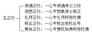 正行有五种,名为「五正行」,即是「读、观、礼、称、赞」,亦即:一读诵正行,二观察正行,三礼拜正行,四称名正行,五赞供正行。