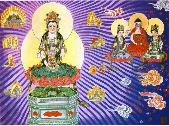 次观大势至菩萨。此菩萨身量大小亦如观世音。圆光面各百二十五由旬。照二百五十由旬。举身光明。照十方国。作紫金色。有缘众生皆悉得见。但见此菩萨一毛孔光。即见十方无量诸佛净妙光明。是故号此菩萨名无边光。以智慧光。普照一切。令离三途。得无上力。是故号此菩萨萨名大势至。此菩萨天冠。有五百宝华。一一宝华。有五百宝台。一一台中。十方诸佛净妙国土广长之相。皆於中现。顶上肉髻。如钵头摩华。於肉髻上。有一宝瓶。盛诸光明。普现佛事。馀诸身相。如观世音等无有异。此菩萨行时。十方世界一切震动。当地动处。有五百亿宝华。一一宝华。庄严高显。如极乐世界。此菩萨坐时。七宝国土。一时动摇。从下方金光佛刹。乃至上方光明王佛刹。於其中间。无量尘数分身无量寿佛。分身观世音。大势至皆悉云集极乐国土。畟塞空中。坐莲华座。演说妙法。度苦众生。