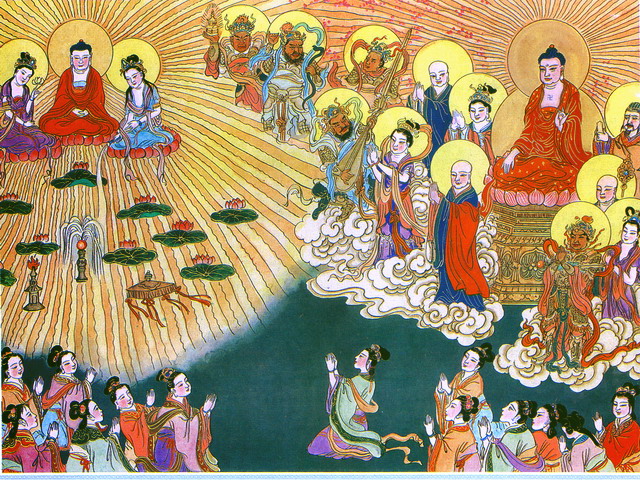 说是语时。韦提希与五百侍女。闻佛所说。应时得见极乐世界广长之相。得见佛身及二菩萨。心生欢喜。叹未曾有。豁然大悟。得无生忍。