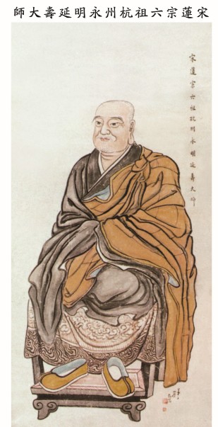 寿大师(公元904-975年),唐末五代十国时僧人。俗姓王,字冲元,本是江苏丹阳人,后迁居浙江余杭,吴越王钱穆时,曾为余杭库吏。青年时既信仰佛教,戒杀放生。年二十八任华亭镇将。督纳军需。见集市中鱼虾飞禽等,每生慈悯心而购之放生,后来因擅自动用库钱买动物放生,事发之后,王镇将被判处死罪,押赴市曹处斩之际。面对死刑,王镇将镇静自若,毫无惧色。自言:“吾为活数万生命而死,死又何憾!”文穆王知道王镇将擅用库银并无私用一文。同时也赞许王镇将的慈心善举。便将其特赦免刑释放。并听其投明州四明山(今浙江鄞县境内)龙册寺翠岩令参禅师剃度为僧,法名延寿,字智觉。由此而成就了后来在中国佛教史上名扬四方的高僧-延寿大师。是岁大师年方三十,时维公元933年。
