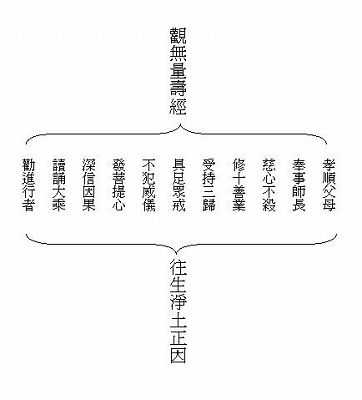 换句话说,因修清净业因,所得的清净业果,种什么因,是必然得什么果报的,这一连串的因缘果报,是构成净土的展现,我们欲得净土的归宿,必须修净土的正因,方能达到净土的彼岸,在观无量寿经很明显的告诉我们说,往净土必须勤修净业正因,凭此净业正因,方得生于彼佛国土,现在分别叙述如下: