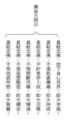 蕅益大师云:『念得阿弥陀佛熟,三藏十二部极则教理都在里许,千七百公案,向上机关,亦在里许,三千威仪,八万细行,三聚净戒,亦在里许。』