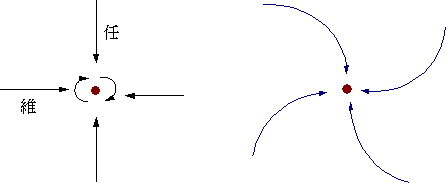 在前述「汇通心轮」的脉象中,前之任脉既从头而下,也从腹而上;至于左右脉亦相向而至。以上下左右的脉气,既皆汇通心轮的部位;于是便将在此形成类似『涡流』的气旋。因此『卍』字,不当是有棱有角的直条状,而当是类似于电风扇的四片扇形,从外以「螺形」的方式向内收摄,摄至最后而进入心轮中。关于涡流与气行的方向,我们又可以用物理学上的「右手定则」说明之。