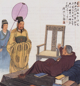 赵州城的赵王特地地拜访赵州从谂禅师,这时赵州从谂禅师正在床上休息,他躺着对来访者说道:“大王!我现在已老迈;虽然你专程来看我,但我实在无力下床接待你,请别见怪。”