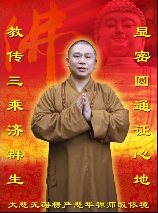 上楞下严比丘,别号悲华[1],来果禅师法孙,为临济正宗第四十八代传人,又名体澄光觉,虚云老和尚法曾孙,法眼正宗第十一代传人,另外,法师还具有南传佛教内观禅的传承和藏传佛教大圆满的传承。