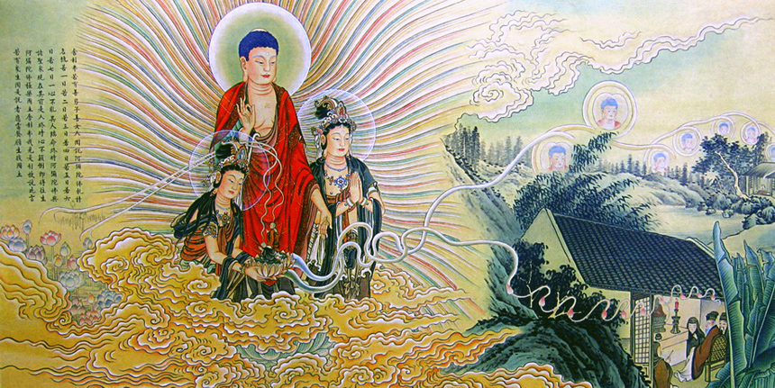 舍利弗,众生只具备少许善根、福德、因缘是不得往生极乐国的。假使有善男子或善女人听到阿弥陀佛,能至诚恳切地执持名号,若一天、若两天、若三天、若四天、若五天、若六天、若七天,能一心不乱;等到寿命终了时,阿弥陀佛就会同其他圣众现身在他(她)面前,使该人临终时心不颠倒,即得往生阿弥陀佛极乐国土。