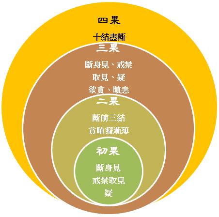 梵文称之,须陀洹果,译为入流。指初见真理,入圣人之流。初果圣者,具足正见,对三宝、戒律净信不疑,已破下列三种束缚: