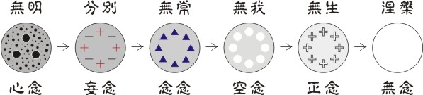 从「妄执」的分别,到诸行「无常」,进而认识「我」的本质是「无我」,此时唯有寂静的感觉,心念好似静止的状态,但不可沈守空寂而执空;应再思惟「无我」的真实义,才能了悟生命的意义,及万物生生不息的由来。