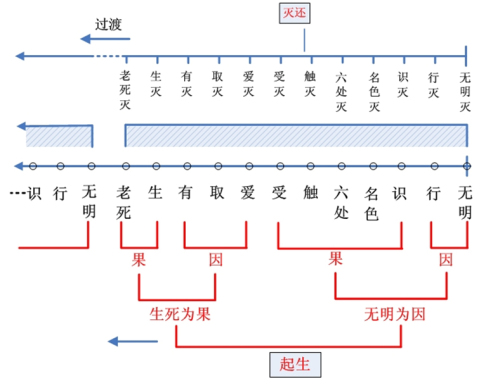诸佛菩萨让我们用这种如理的方式进行思维,对十二缘起的生起过程进行思维,还要进行反向的缘起还灭过程的思维,(法师指向板书:下面是生起的过程,上面是还灭的过程),这两个过程让我们去思维。但是不要思维缘起的合法性,就像不要思维因果的合法性一样,就像不要思维释迦牟尼佛到底有没有圆满智慧一样,这种思维事实上就是对于甚深智慧从根本上的否定。那么我们就依着这种形式来思维缘起法就可以了。
