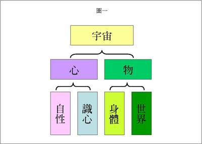 现在回头再来看心和物。我把我们居住的宇宙分成心和物两大类,两大类之下再细分四个层次。就是「心」包含「自性」和「识心」两个层次;「物」包含「身体」和「世界」两个层次(如图一)。