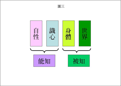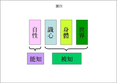 这个时候要注意,从身体到世界全都是被知。什么是能知?从识心到自性是能知。刚才这个身体还是属于能知这一边,我们眼睛闭起来去感觉自己的身体的时候,它就变成被知而不再是能知了。我们接着再往上推,什么是「识心」?「识心」就是会想东想西的心。大家注意,有的时候你在想东想西而不自觉,但是当你知道自己在想东想西,也知道自己在想什么的时候,想东想西的识心又变成被知了。这时「识心」被谁知呢?就是被「自性」知。在这个时候就不只是识心是被知了,从识心到身体再到世界,全部都是被知,这个时候只有自性是能知。刚才我们把能知与被知间的界线又推进了一次,原来是能知的识心,又变成被知了。(如图四)