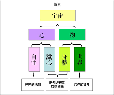 再来看物质世界,这个物质世界可以说是纯粹的被知,因为它从来没有变成能知过啊!它是纯粹的被知,永远都是被知。于是我把纯粹的能知和纯粹的被知中间称为混合区,因为有的时候它是能知,有的时候它又是被知,所以称为混合区。不过,它成为能知的时候,一定要跟纯粹能知站在同一边,纯粹能知就是自性。所以「能知与被知」跟「心与物」之间的关系,最好的定义就是:能知是心,被知是物,中间是心、物混合区(如图五)。