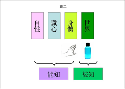 现在我拿着这瓶水,我这样子一拿的时候,你们说能知与被知的界限在哪里?这个界线当然是在我的手与水瓶之间。界线画下来了,能知这一边包括手、身体、识心、和自性;被知这一边则包括水瓶和这个世界所有的东西。简单地说能知与被知的界限,就是在身体与物质世界之间(如图二)。