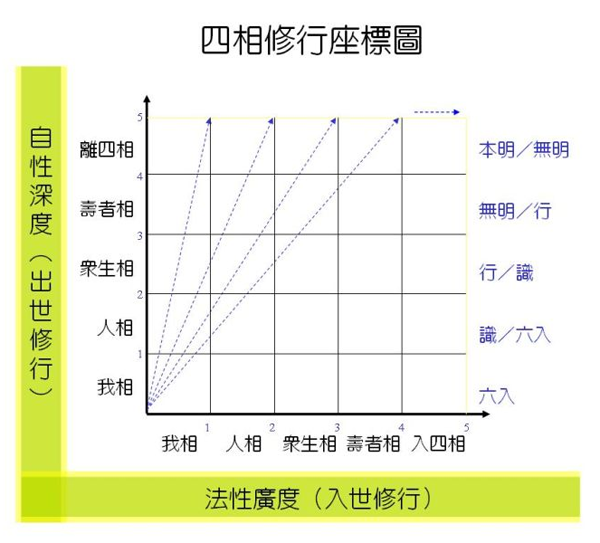 第二套是法性广度的四相,是水平的X轴。也有我相、人相、众生相、寿者相,到最后入四相。这是入四相,并不是离四相。为什么呢?因为法性广度的四相一直都有相。我们要特别说明,这是入世间来修行的。