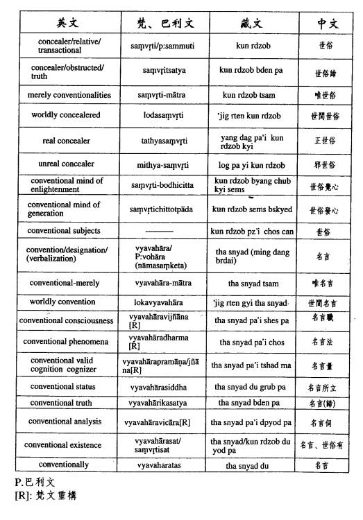 以下是各依“世俗”及“名言”所建立的系列常用中观哲学术语的英、梵/巴利、藏、汉文对照表。